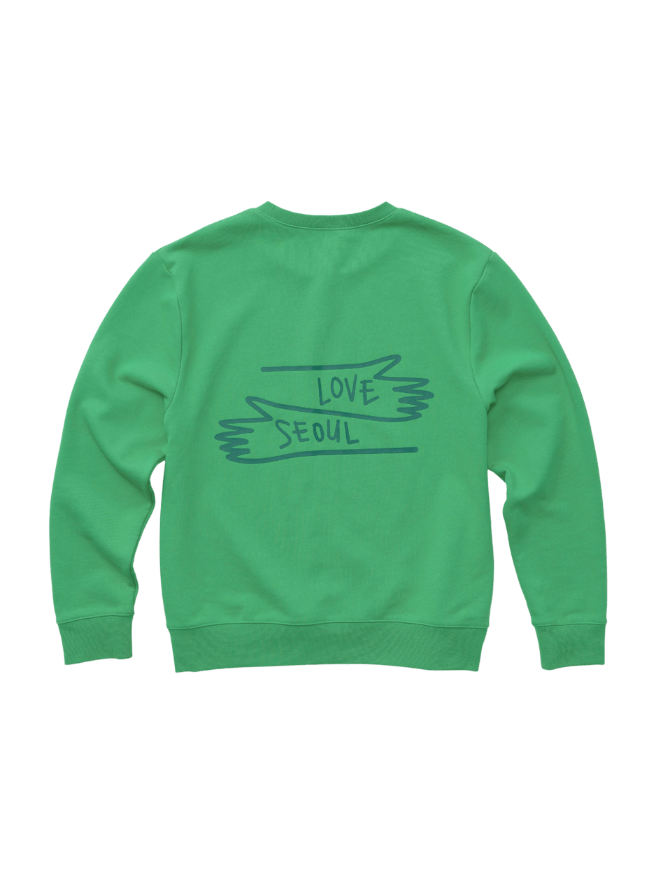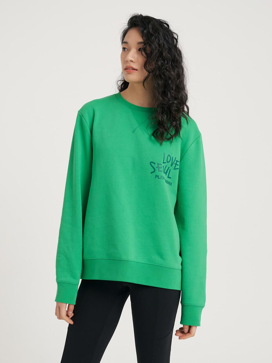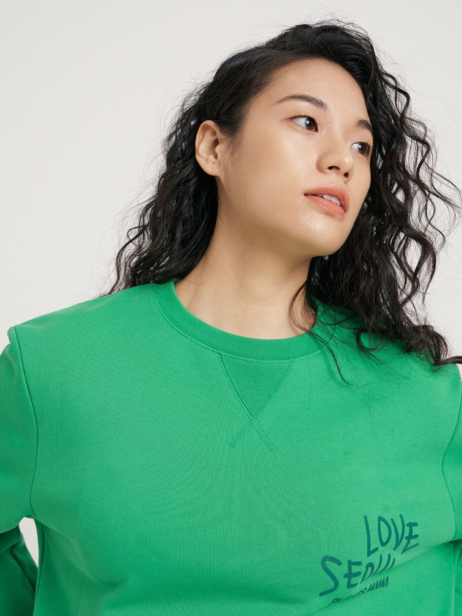 It is made of environment-friendly materials recycled from PET bottles. / The French terry texture makes these sweatshirts light and refreshing further. / A blend of recycled polyester and cotton allows for a more casual style. / The crew neck in a semi-overfit is for both men and women.