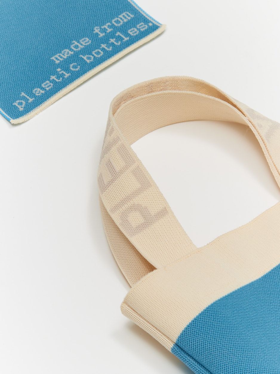 It is made of environment-friendly materials recycled from PET bottles. / The knitted bucket-style Canoe Bag is perfect for vacation spots. / PLEATSMAMA’s new non-pleats design prevents it from being stretched out, which reinforces its durability while simultaneously ensuring the flexibility of knit bags. / It features the design with PLEATSMAMA's Heritage Knit Pleats Inner Pocket and the bag bottom with an eco-friendly message.