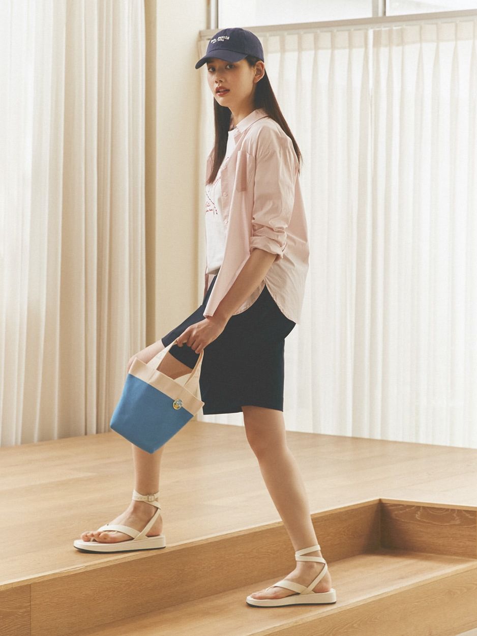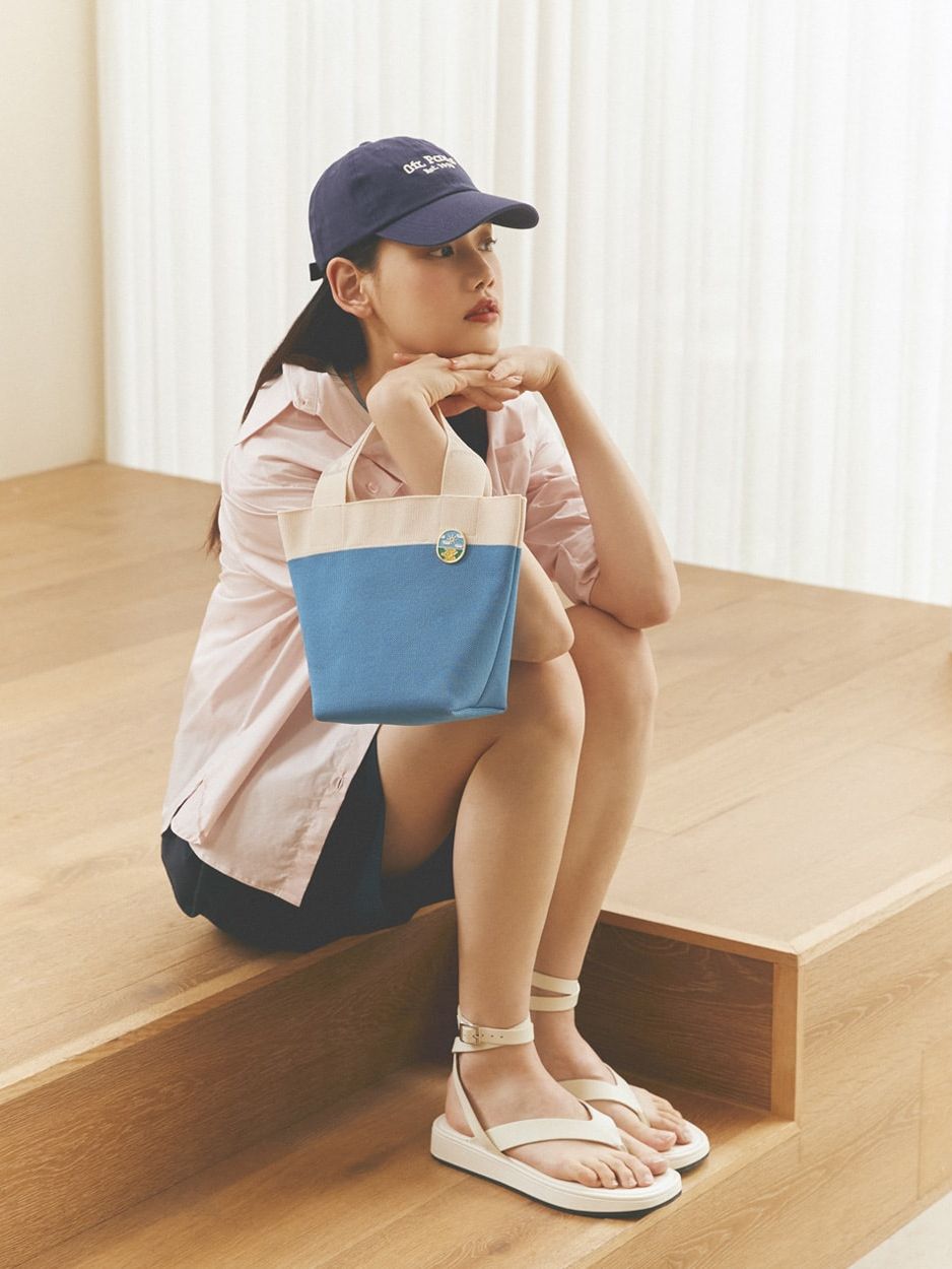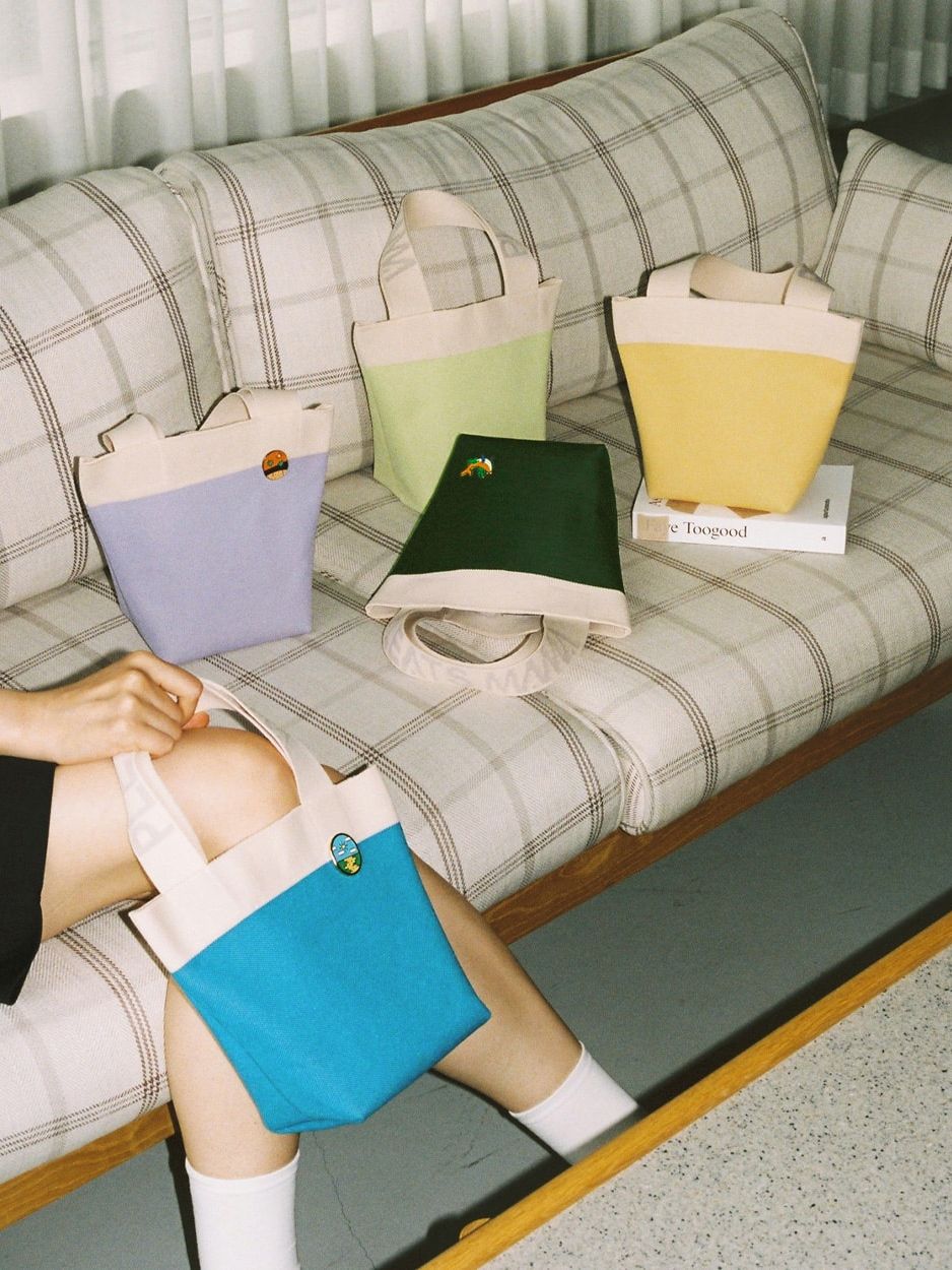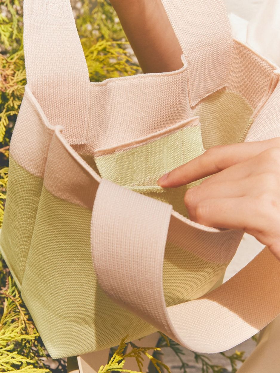 It is made of environment-friendly materials recycled from PET bottles. / The knitted bucket-style Canoe Bag is perfect for vacation spots. / PLEATSMAMA’s new non-pleats design prevents it from being stretched out, which reinforces its durability while simultaneously ensuring the flexibility of knit bags. / It features the design with PLEATSMAMA's Heritage Knit Pleats Inner Pocket and the bag bottom with an eco-friendly message.